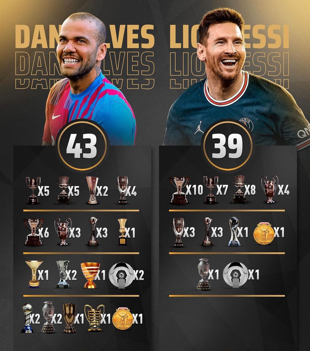 وفي هذا الصدد، نشر ألفيش على حسابه في موقع "إنستغرام"، صورة مركبة تجمعه بميسي، تضم الألقاب التي حققها كل منهما.