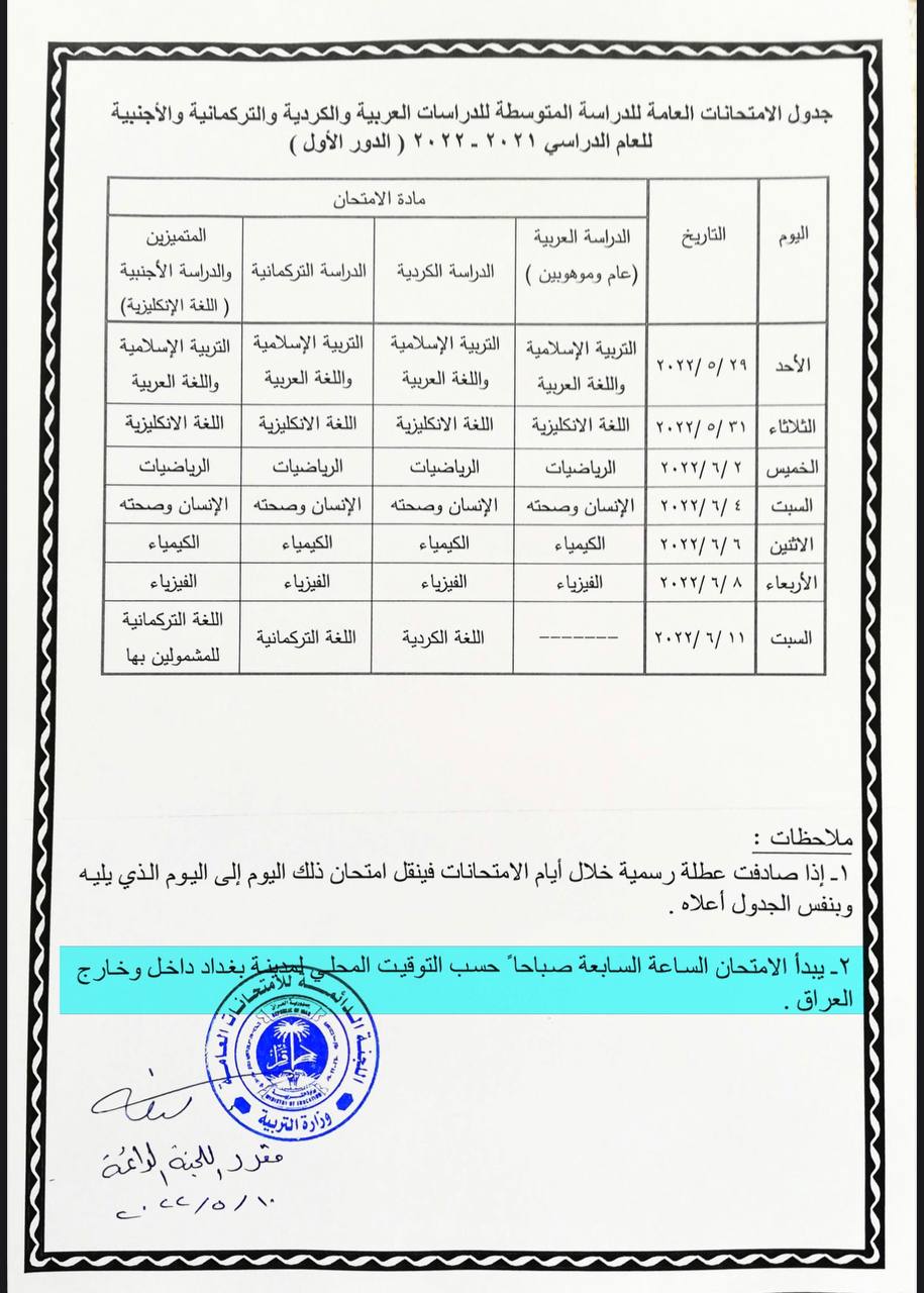 نشرت وزارة التربية، اليوم السبت، جدول وموعد امتحانات طلبة الثالث متوسط، فيما أشارت إلى أن الامتحان يبدأ الساعة السابعة صباحاً